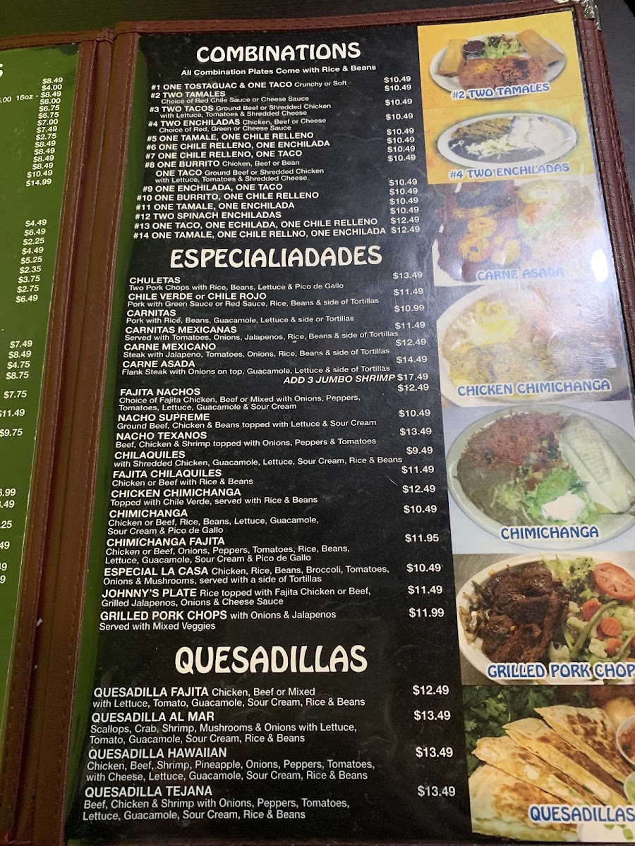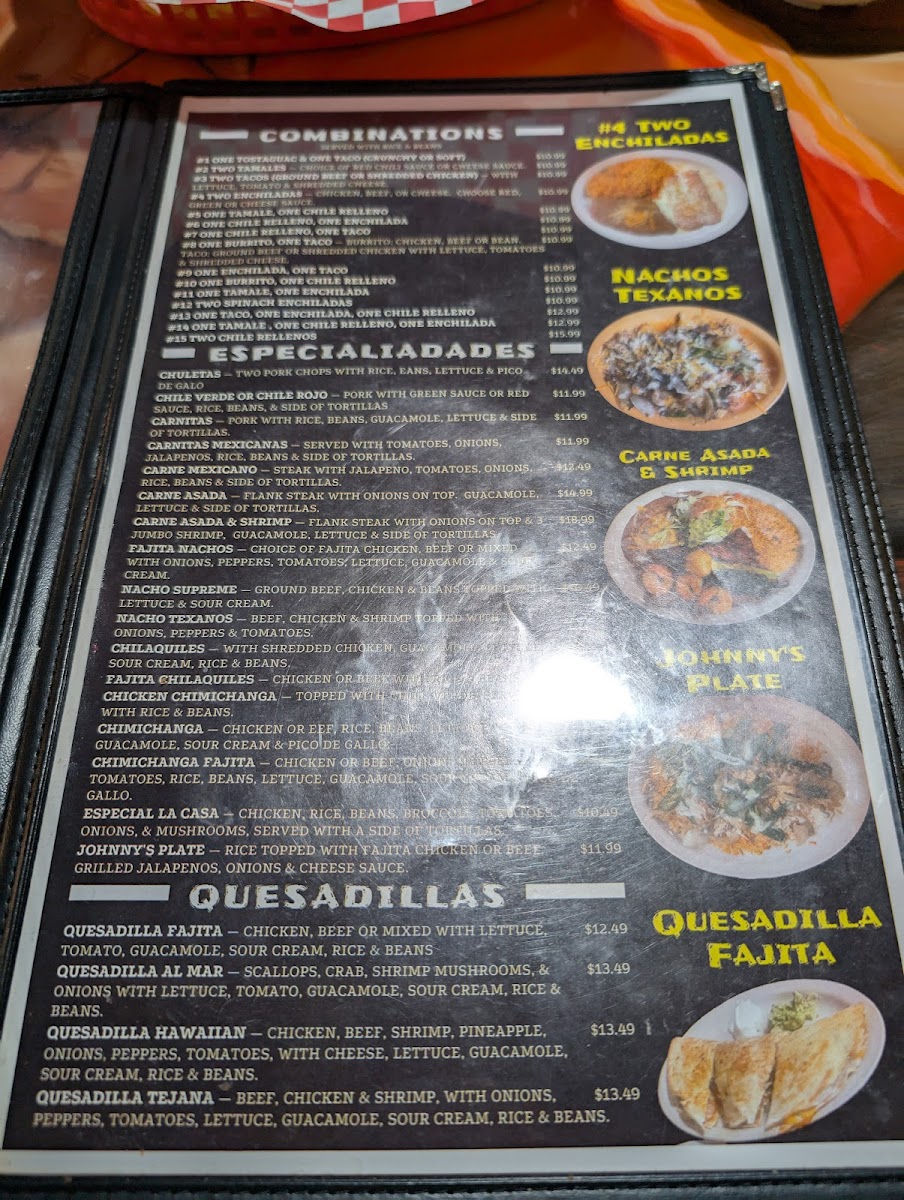 Desserts and other specialty items include sopapillas and unique dishes like Mojarra Endiablada and Hawaiian Fajita Plate, providing additional variety.